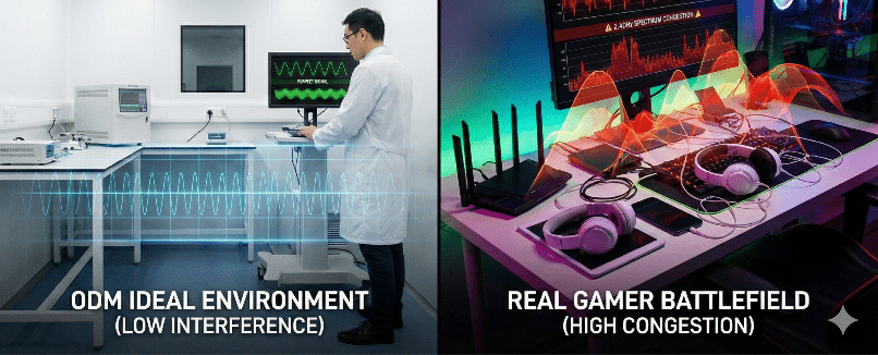 標準認證大多在「電波隔離室」等理想、低干擾環境中進行。真實玩家環境卻充滿干擾來源:Wi-Fi 6/7 路由器、藍牙耳機、手機等 2.4GHz 裝置。即使通過認證,裝置在多裝置、多協定互動情境中,仍可能存在相容性與穩定性缺陷。