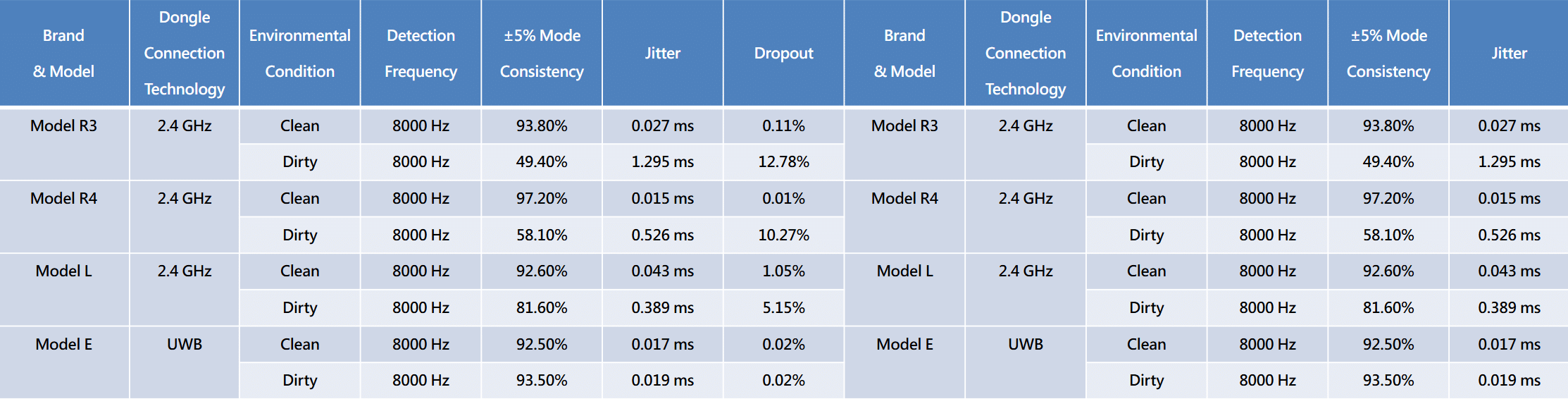 為了驗證這些盲點,百佳泰實驗室採用「生態系情境模擬」,在2.4GHz主戰場上測試三款2.4GHz 8K滑鼠,並加入一款使用不同頻段架構的對照組,模擬從Clean (無干擾) 到Extreme (Wi-Fi全滿載) 的漸進式壓力。下表是市售4款旗艦8K無線滑鼠在無干擾與極限干擾下的真實情況: