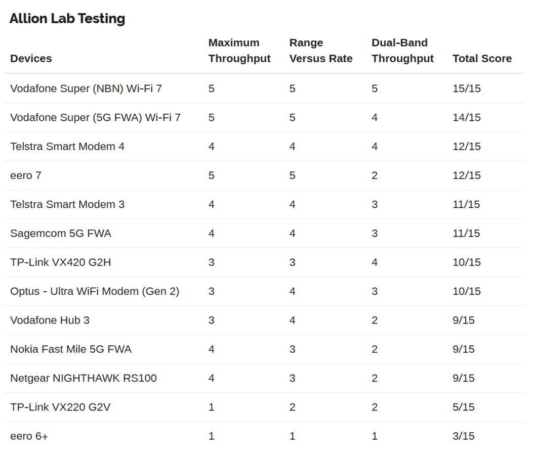 本次效能基準測試遵循 BBF TR-398 標準,該標準為全球公認的室內 Wi-Fi 性能評估規範,涵蓋射頻性能、覆蓋範圍和頻寬等核心指標。百佳泰將Vodafone Super Wi-Fi Modem 與市面上其他十二款 Wi-Fi AP 進行了比較測試,結果顯示,Vodafone Super Wi-Fi Modem 在吞吐量等關鍵效能項目中表現最佳。