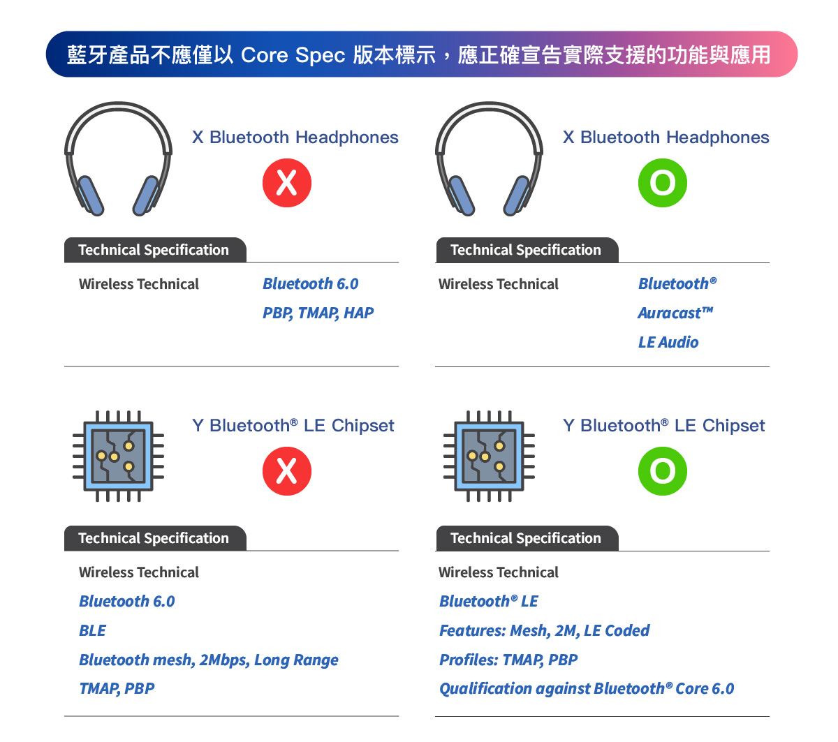 來決定產品是否需要測試、測試項目範圍、既有設計如何組合。此一制度設計,正是因為多數藍牙產品並非完全從零開始,而是引用晶片商、模組商或既有會員設計,且不同產品在功能與應用上差異極大。因此,SIG也一再提醒會員藍牙產品不應僅以Core Spec版本作為標示,而應正確宣告實際支援的藍牙功能與應用。