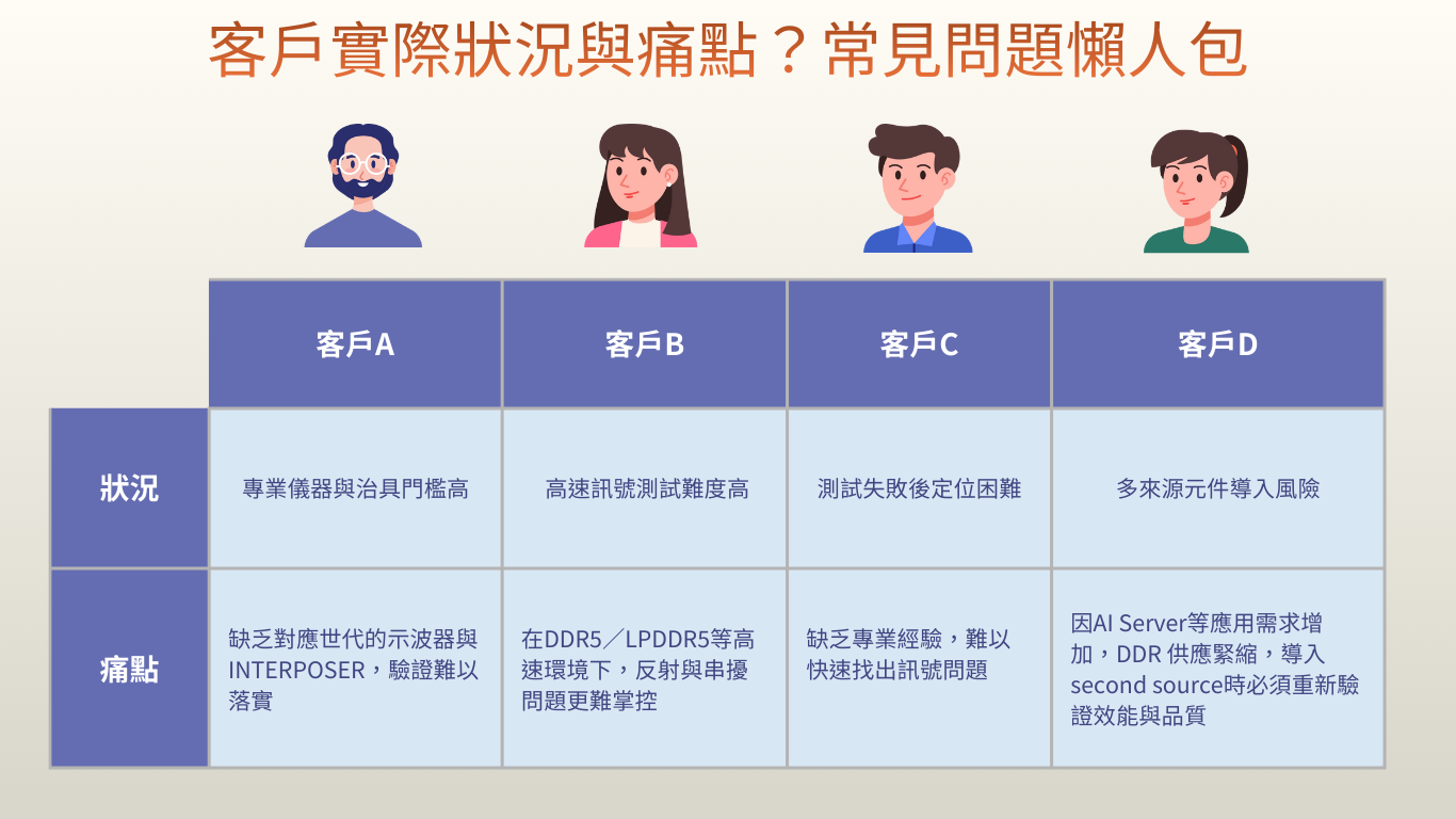 憑藉先進的量測設備、專業測試治具和豐富的實務經驗,已全面支援DDR5和LPDDR5,協助客戶快速驗證設計、故障排除問題並優化解決。