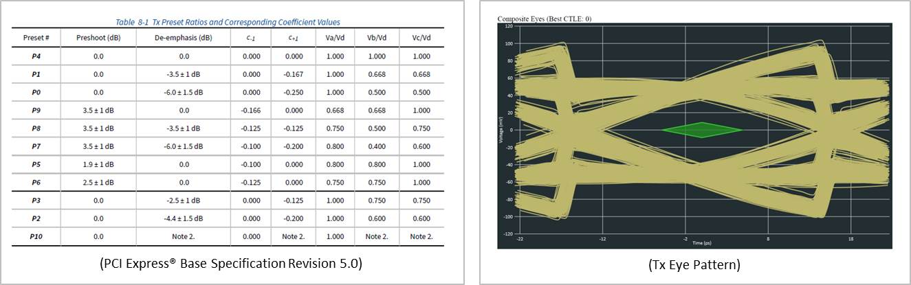PCIe規格演進到3.0後,考量到高速訊號的衰減,因此定義了11種Preset mode來提供系統跟裝置間在建立連結時能採用最適合的preset訊號,確保其穩定性。在電器訊號品質驗證中,考量到PCIe的向下相容性及各種preset的訊號都必須驗證的情況下,現今單一lane所需要量測的Tx 訊號眼圖就高達36個 (PCIe 1.0~ PCIe 5.0)。一個x16的Slot就需要量測576個眼圖,以一台可插8張運算加速卡的伺服器舉例:其8個x16的Slot一共要量測4,068個Tx訊號眼圖,對於量測部門而言,在人力與量測設備 (高頻示波器) 的長期佔用都將會是一個極大的負擔。